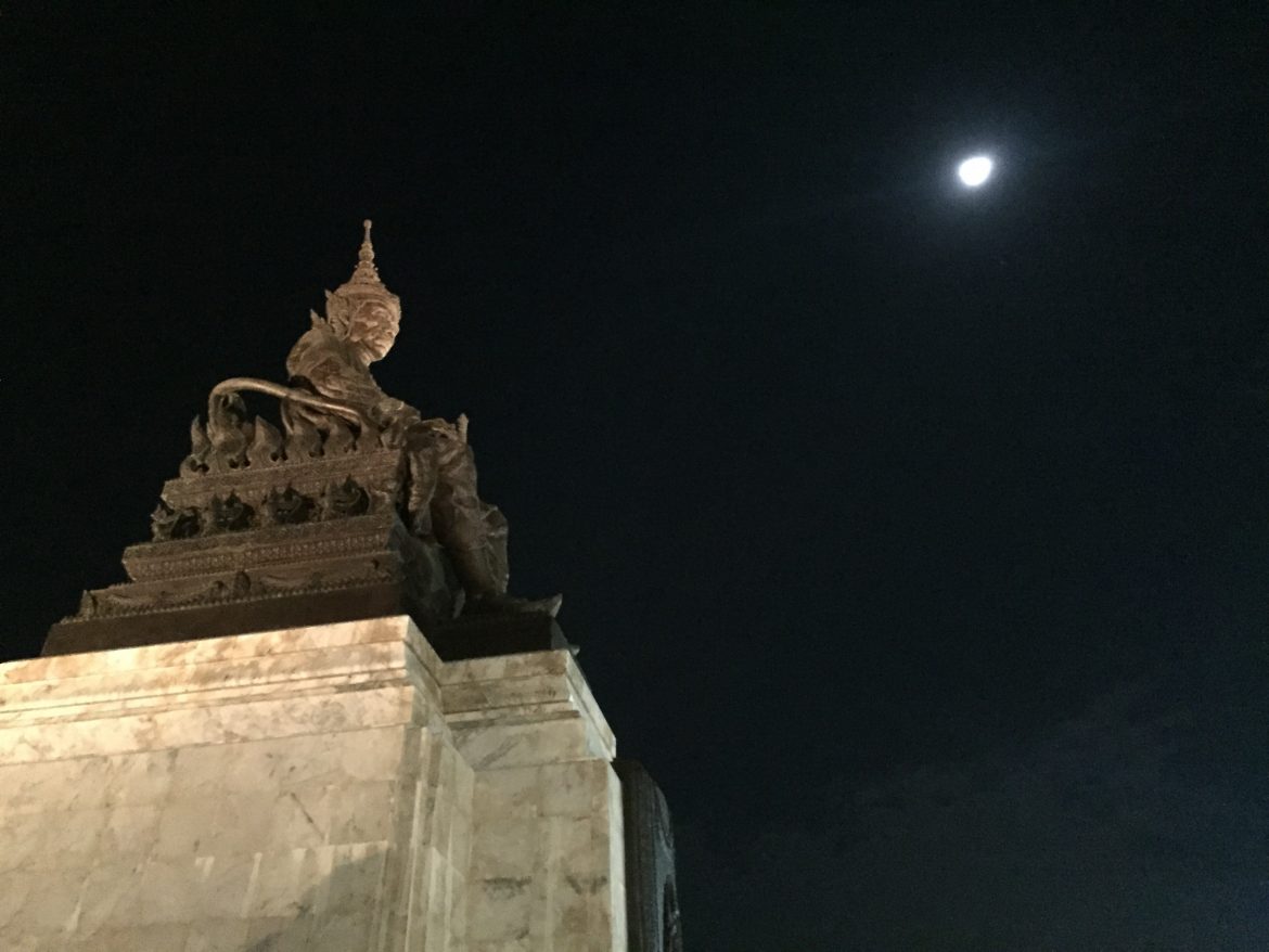 铜像面朝碧武里山上的行宫、佛塔和气象台。蒙固王是拉玛四世,君王雄才大略,传说性喜浪漫。山坡种满鸡蛋花树,小径弯弯,枝叶遮住浮屠。山脚有大群猴子争抢地盘,在电杆线上吱吱晃荡。