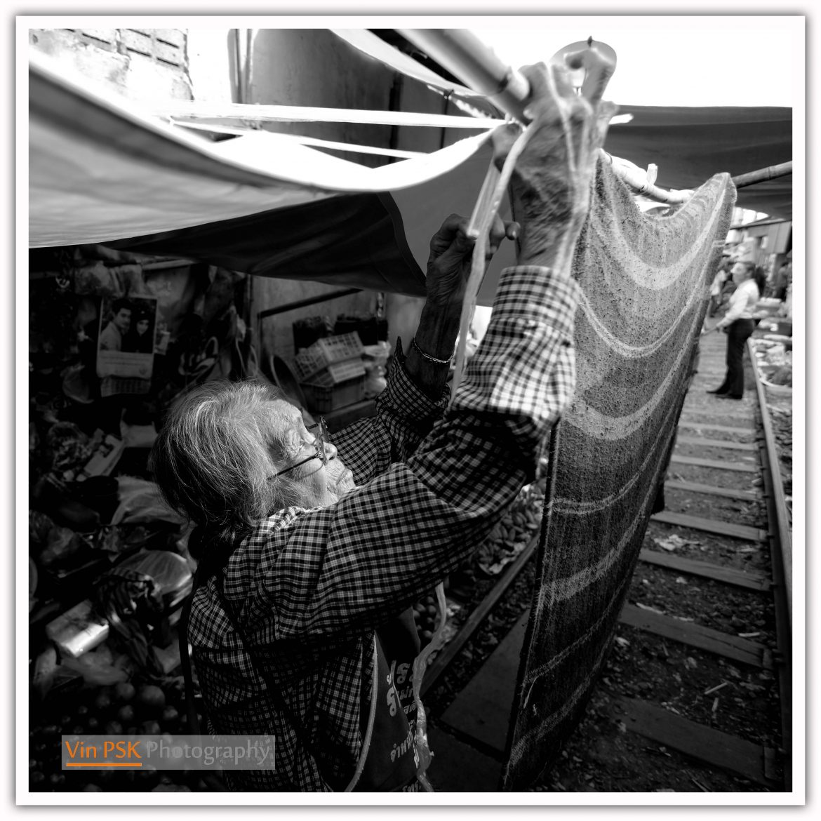 菜贩的篮子近在咫尺,有轮子连接小轨,可以轻易拉进推出。不一会,站长广播:火车将进站。摊贩快手快脚,拆下铁支帐篷,移动货架。小篮蔬菜,索性置放在铁轨中间。气笛响起,火车一节一节经过,车上车下的游客,互相摄影。车厢与货物帐篷的间隙,只差厘米。厚重的金属掠过,轨间的蔬菜安然无恙。车厢尾巴后,帐篷一个一个被重新架起。最后一节车厢怡然离去,一切回归原位,市场恢复运作。水过无痕,好像什么都没有发生过。