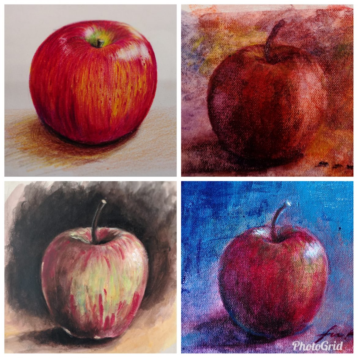 我画苹果却是为了课堂示范。不管是用彩色铅笔还是压克力颜料,苹果都是很好表现的题材。它的造型、明暗、色彩和细节,可让初学者深入探讨,从中踏入艺术的乐园。