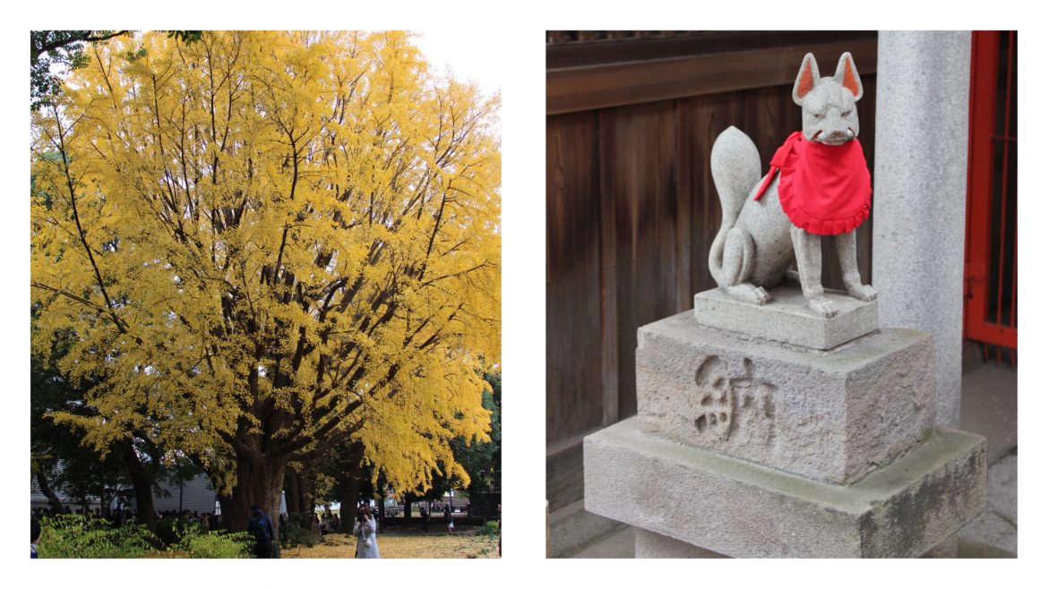 无意间走入花园稻荷神社,那颈上围着红围巾的狐狸雕像,着实吸引人。尤其是石雕身躯横摆,嘴脸却直接望着,正面对神社正面的我。那狐仙雕像认真模样,好像一只狐仙坐在那里,可以望穿一个人的灵魂般令人毛骨悚然,却不减其“仙”性。这一带还出现在神社左右的石雕包括:围着红围巾的狗怪石雕,眼神不似两只狗对望,而是斜歪着四十五度,底下刻写“纳”字,似黑橙粱柱的回廊柱子上,每排左右两根柱子都各写着“奉”与“纳”字,祈请参访者捐善款,同时也纳这块大地之气。而在屋顶上的鹤或鸟雕,或在恩赐公园芭蕉翁之碑上,神奇的瞥见可爱的河豚雕像造型,神往的创意造型。这些雕像配合地形,庙宇的设计,视觉效果,实际效应,巧妙地安置在各自舒适的角落,扮演好自己的角色。