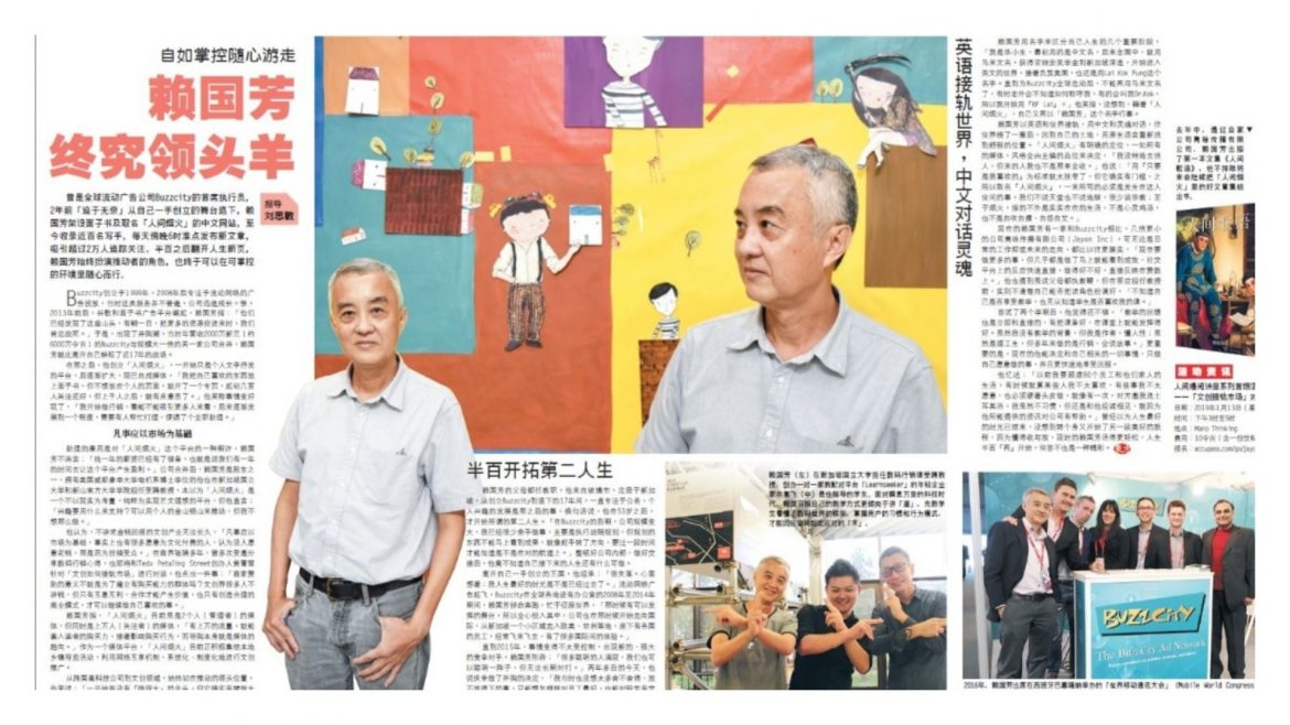 2K 刘思敏 东方日报 – 2019年1月1日 曾是全球流动广告公司BuzzCity的首席执行员,2年前「迫于无奈」从自己一手创立的舞臺退下,赖国芳架设面子书及取名「人间烟火」的中文网站,至今收录近百名写手,每天傍晚6时准点发佈新文章,吸引超过2万人追踪关注。半百之后翻开人生新页,赖国芳始终扮演推动者的角色,也终于可以在可掌控的环境里隨心而行。 » 继续阅读 下载 PDF 支持作者喜欢这个作品?请略表心意。 刘思敏赖国芳 Share 0 FacebookWhatsappTelegramLINEEmail 上则 爸爸 下则 马六甲河水 缓缓流淌 相关内容 沈阳和长春 · 风流总被雨打风吹去 陶公府 · 伯公墓 信的告白2.0 · 未来和过去的对话 北京 · 大国之都 打开一扇门 希君生羽翼 一化北溟鱼 香港 · 庐山烟雨 泉州 · 侨批 会安 · 无题 ChatGPT参加我的考试