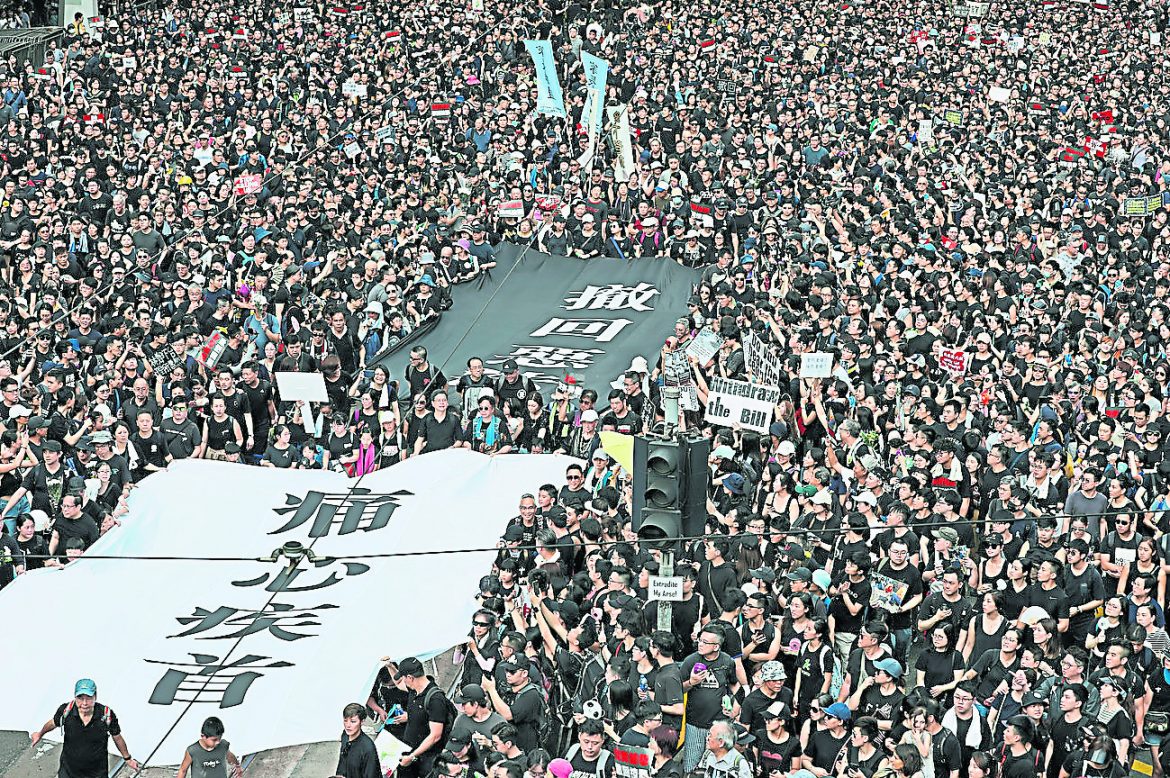 Protesters carry a huge banner that reads “Our hearts are torn to pieces. Withdraw the monstrous bill” as they march on the streets against an extradition bill in Hong Kong on Sunday, June 16, 2019. Hong Kong residents Sunday continued their massive protest over an unpopular extradition bill that has highlighted the territory’s apprehension about relations with mainland China, a week after the crisis brought as many as 1 million into the streets. (AP Photo/Vincent Yu)