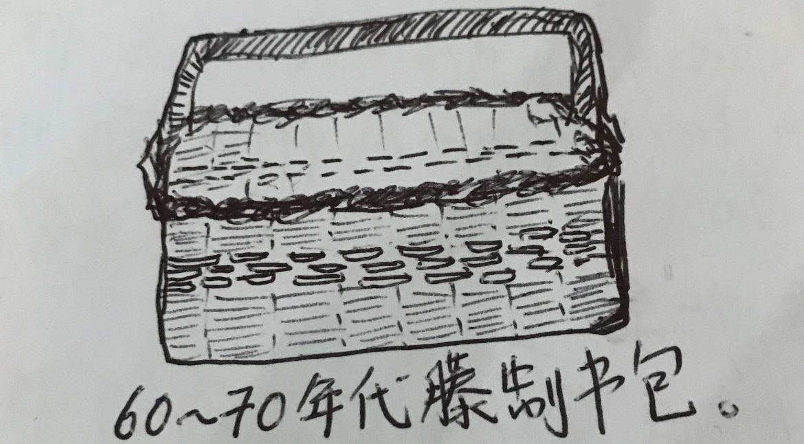 60年代小学生的书包是一个长方形,菜篮子式的藤制品。奢侈美观一些的中间附有彩色的塑料横条。藤书包卖价一零吉左右,其耐用的程度则取决于该学生如何运用。