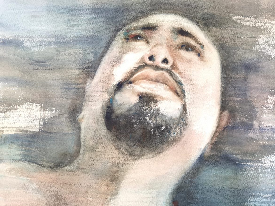 近日刚完成了一副自画像,使用了由下往上仰视的构图,这是个不容易掌控的角度,因为透视的原理近大远小,脸型会呈现很夸张的透视变形,稍一不慎就会画得荒腔走板。