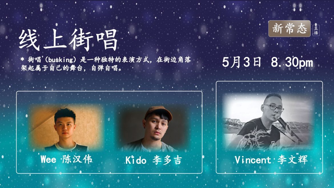 街唱(busking)是一种独特的表演方式,在街边角落架起属于自己的舞台,自弹自唱。路人的一个微笑、一个眼神、一声鼓励、一杯饮料、一包食物、一个打赏、甚至一张名片,也许就足以让街唱者开怀一整天。在新常态里,街唱将以什么形式出现呢?Vincent, Kido 和 Wee, 透过网络直播和《人间烟火》直播贵宾卷,展开一场别开生面的街唱。
