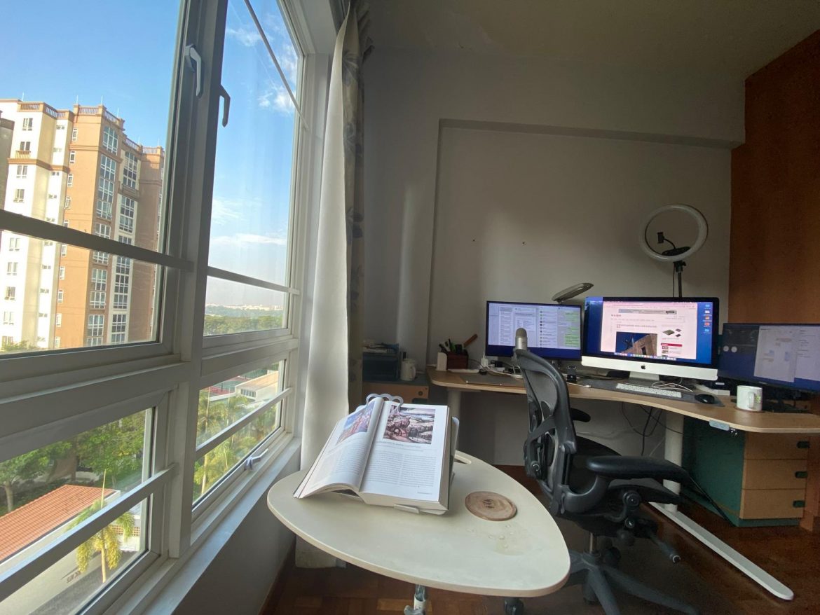儿子搬离家后,他睡了二十多年的卧室,变成了我的家居办公室。这间房有两扇窗,日光充沛。站在窗前,可见八楼底下的居民走动、遛狗、打网球,隐隐传来击球的声音。小区篱外是勿洛蓄水池,有青葱浓密的树、温柔的水,以及沿着水池散步和慢跑的人们。下雨时,景物抹上一层薄纱。夜里,对岸的灯火在水上躺成直线。