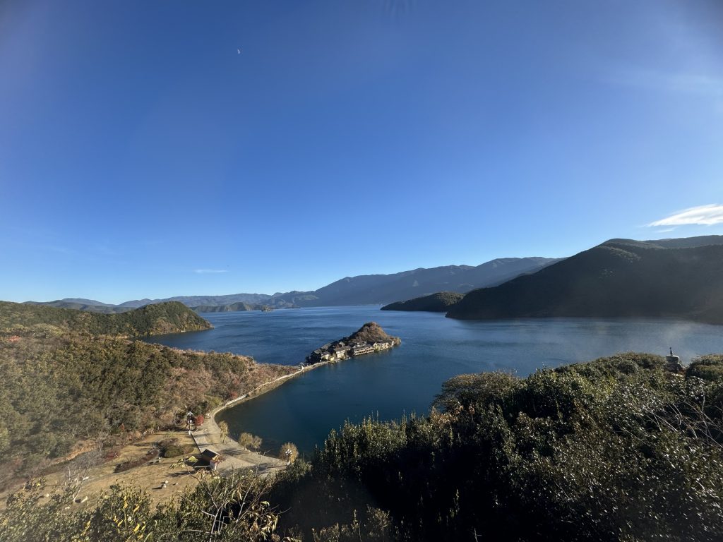 再往北,便是泸沽湖。山路如蛇,盘旋蜿蜒,车缓缓前行,像在接受一场无声的试炼。数小时后,大洛水村悄然现身,湖光山色豁然开朗,仿佛一梦初醒。湖面辽阔而清冷,冬季的泸沽湖不像夏天那般妩媚,她安静、端庄,雾气氤氲,仿佛披了一层轻纱。情人滩边,我们牵着手走了许久,一句也不说,但都明白那份难得的默契。里格半岛、草海、走婚桥,每一个名字背后都藏着摩梭人的传说,而我们只是匆匆过客,留下一些足印和一段和煦的记忆。